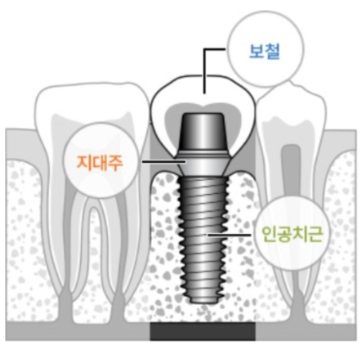 마지막으로, 인공치근과 크라운을 연결하는 기둥인 지대주가 있습니다. 이는 인공치근과 크라운이 안정적으로 유지되도록 지지하는 역할을 합니다.