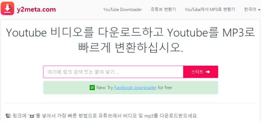 y2meta.com는 1080p의 풀HD 화질까지 다운 및 저장 받을 수 있는 사이트입니다. 저 또한 해당 사이트를 자주 이용 하는데요. y2meta는 링크에 zz를 넣으면 자동으로 다운로드가 되기 시작합니다. 유튜브 영상뿐만 아니라, mp3 파일로도 컨버팅하여 무제한 다운로드가 가능한 것이 큰 장점입니다. 또한, 한국어 지원이 가능한 것도 큰 매력인 사이트입니다.