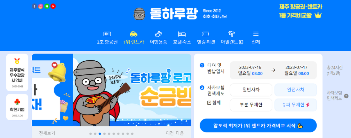 홈페이지를 방문하면 1일 1만 원대부터 저렴한 가격으로 렌트카를 대여할 수 있다는 것을 확인할 수 있습니다. 돌하루팡은 450만 명 이상의 이용객을 보유한 최저가 비교 사이트입니다. 또한, 85개 이상의 업체와 제휴하여 18,000여 대 이상의 차량을 보유하고 있으며, 2021~2023 우수 관광 사업체로 지정되었습니다.